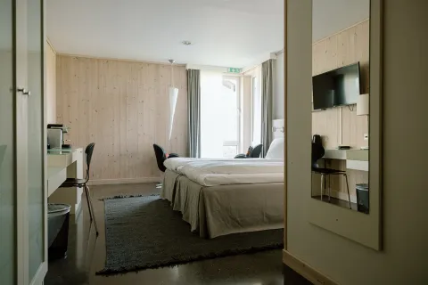 In our comfortable, welcoming rooms, you’ll sleep soundly after a day of Arctic adventure. All rooms are on the ground floor with large panoramic windows, letting in natural light and bringing you close to nature.