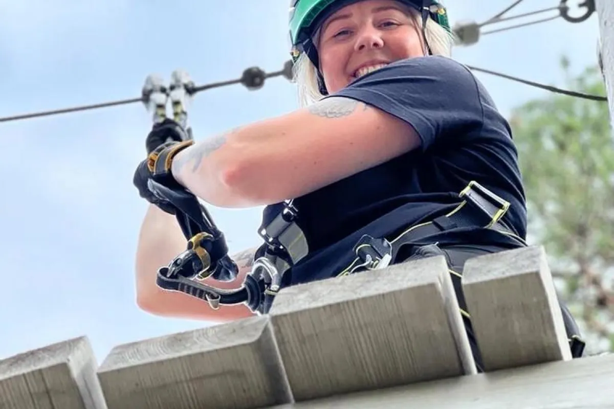 The activity starts with a safety-talk and you get a helmet and a harness that the instructor secures on a rope that goes through the entire course, keeping you safe throughout the challenge. You challenge only yourself and each participant gets to do the course at their own pace, with plenty of room between everyone. You walk between trees on ropes and logs and slowly make your way higher and higher above the forest floor. The course ends on a platform 16 meters above ground from where you take the zipline down on the ground again.