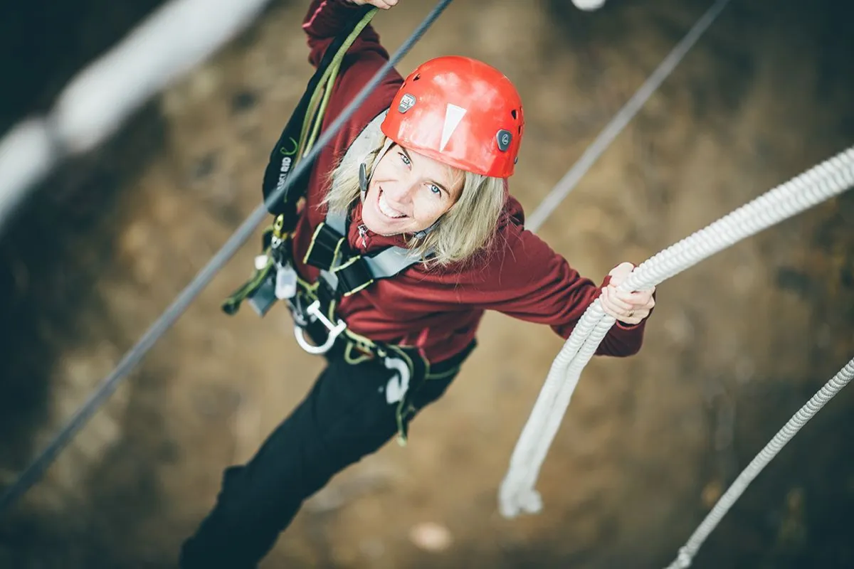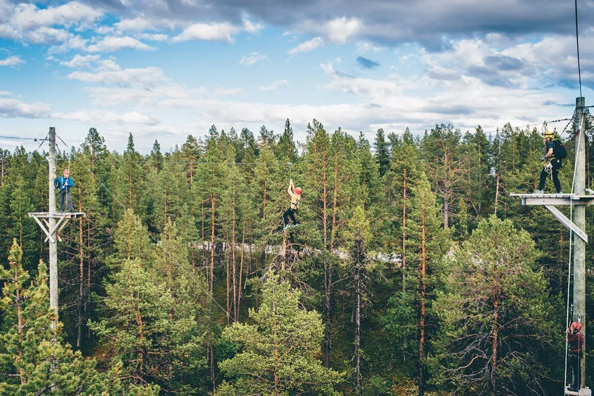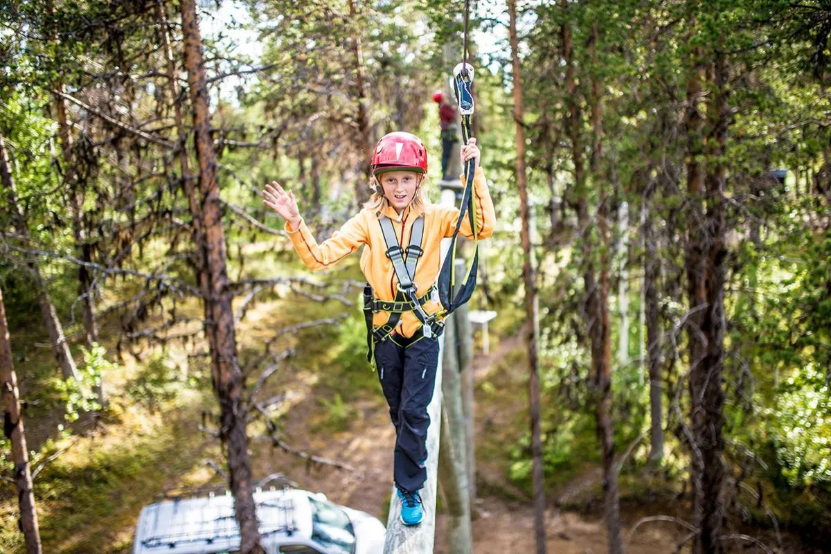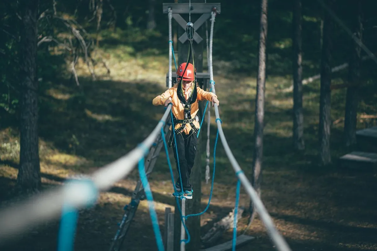 The activity starts with a safety-talk and you get a helmet and a harness that the instructor secures on a rope that goes through the entire course, keeping you safe throughout the challenge. You challenge only yourself and each participant gets to do the course at their own pace, with plenty of room between everyone. You walk between trees on ropes and logs and slowly make your way higher and higher above the forest floor. The course ends on a platform 16 meters above ground from where you take the zipline down on the ground again.