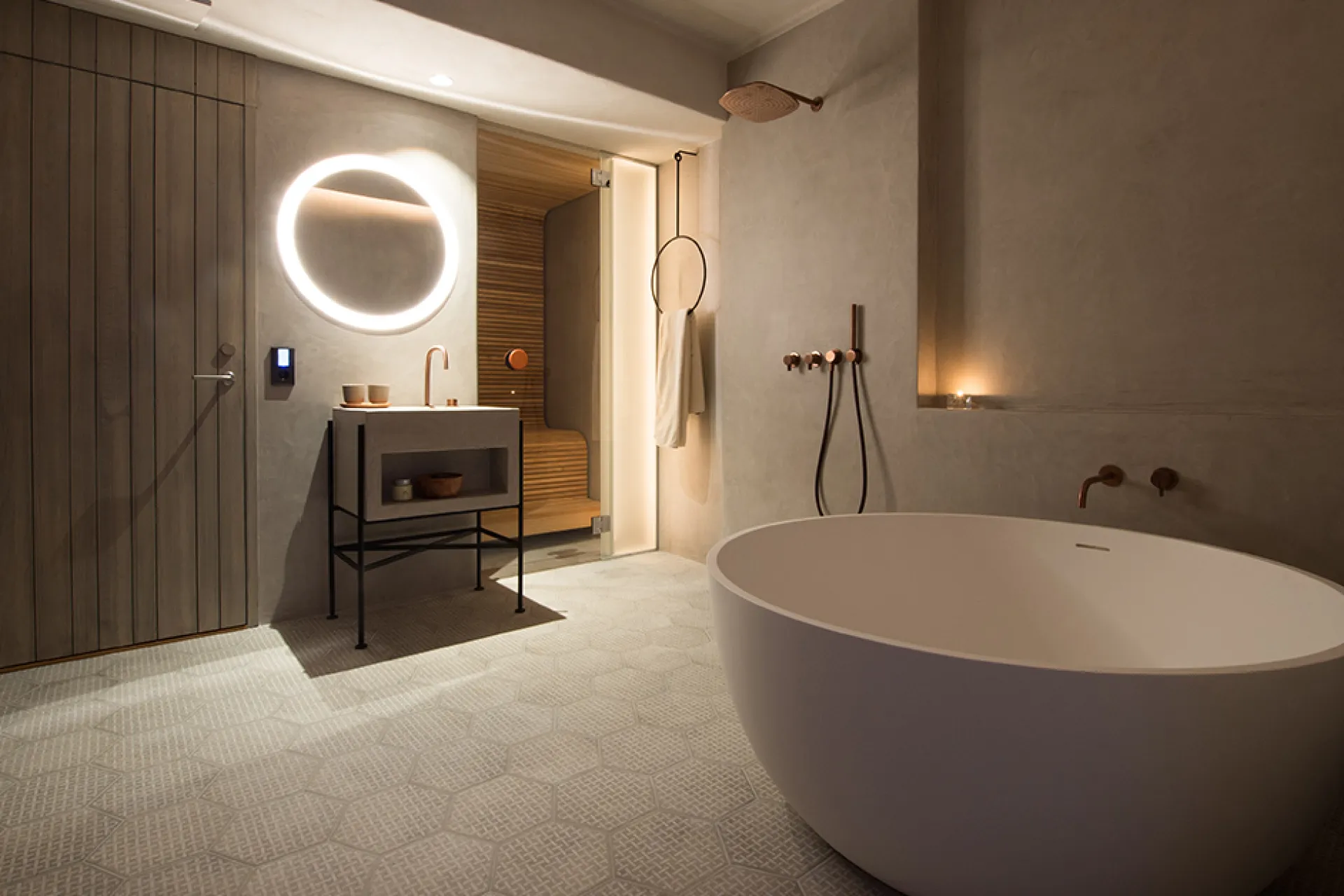 a bathroom with a big bathtub and sauna