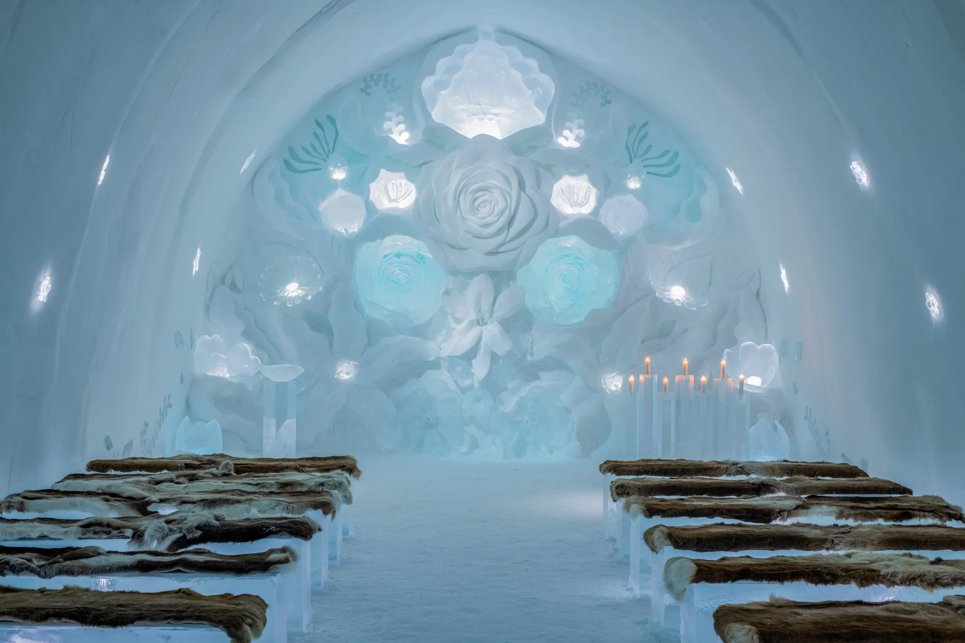 Every year, the Ceremony Hall is sculpted by selected artists and offers an intimate setting for up to 40 guests. The couple is married in a unique environment, with walls, altar details, and benches made of the pure ice from the Torne River.