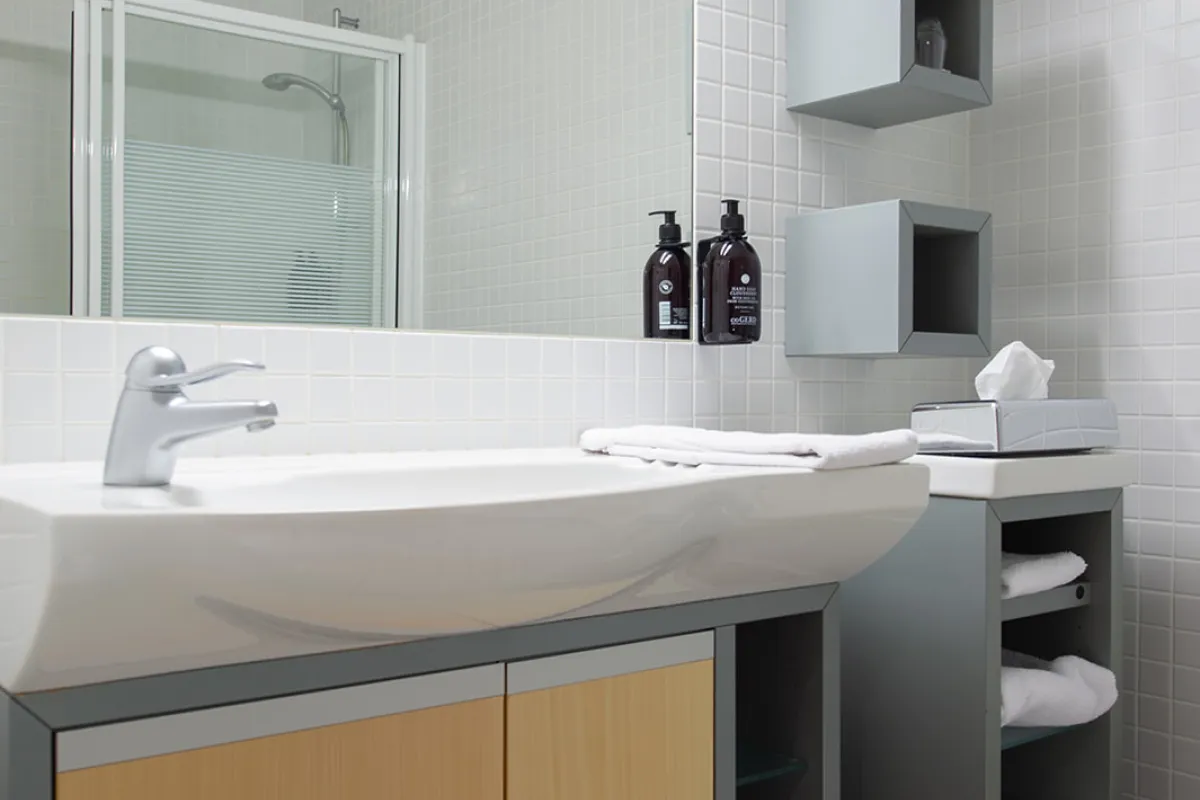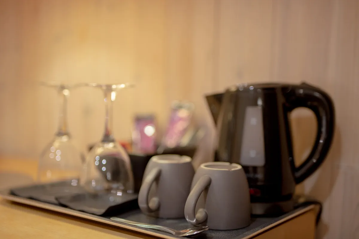 Here, you’ll sleep soundly in a cozy double bed layered with soft pillows and duvets. Our Kaamos hotel rooms also feature comfortable armchairs overlooking the stunning Arctic surroundings. The hallway and tiled bathroom come with heated stone floors to keep you warm on cooler days.