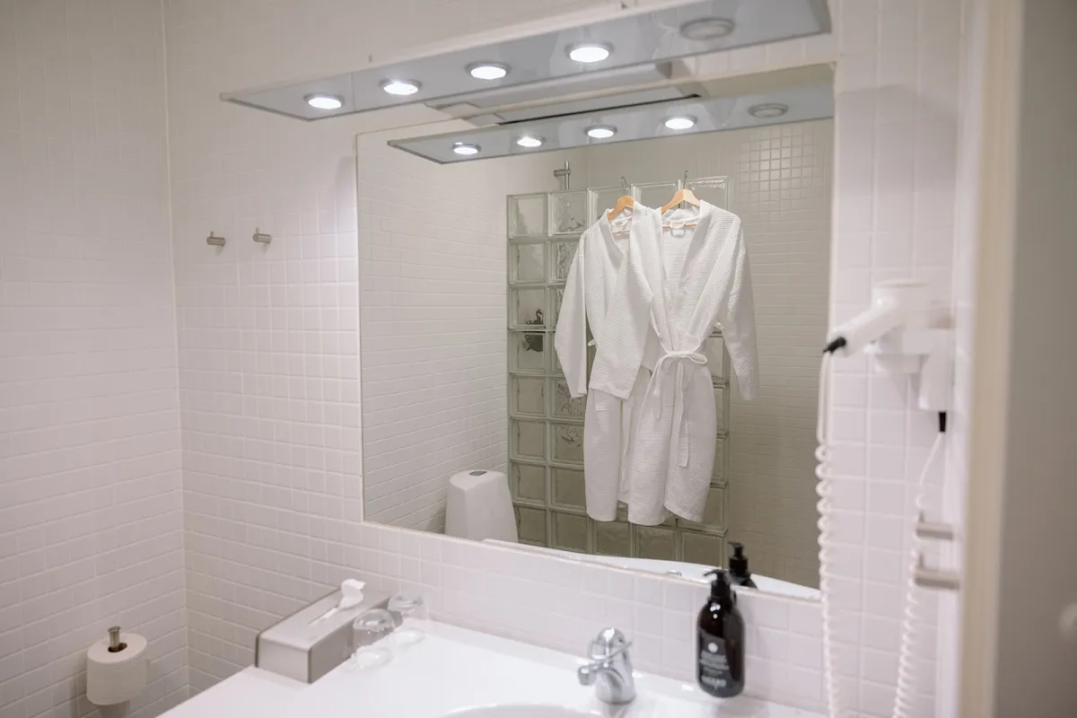 Alongside the comfortable double bed, Kaamos Superior hotel rooms include two armchairs where you can relax and enjoy the scenery outside. There’s also a coffee machine to start your day off right! The hallway and tiled bathroom feature heated stone floors and plush bathrobes, adding a touch of warmth after a chilly day out in the wilderness.