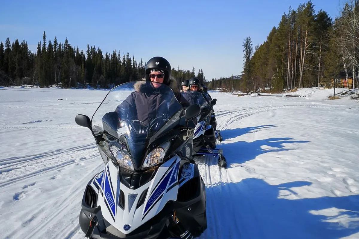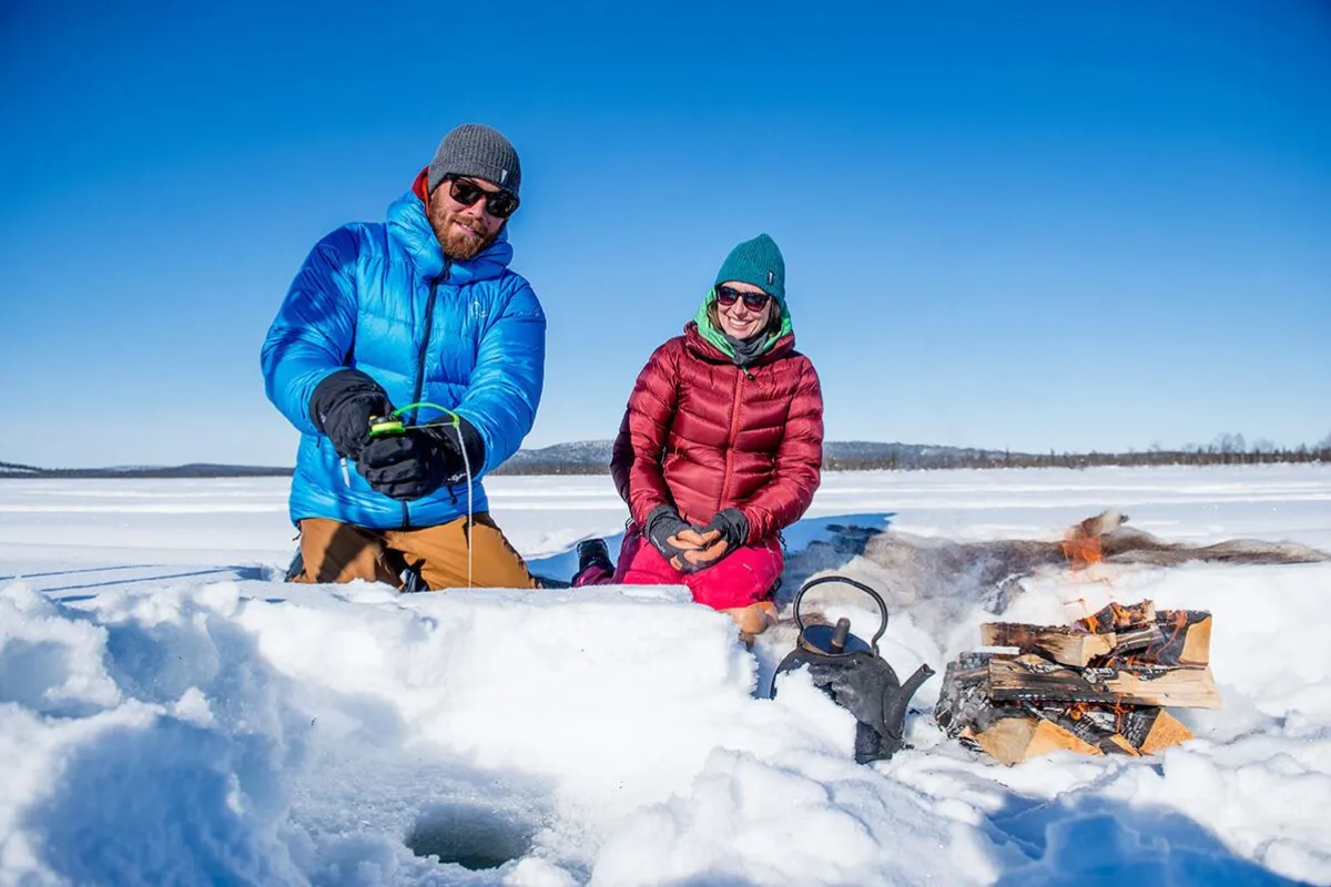 What the second day entails depends on the weather, but in general you will start the day with a morning hike on snowshoes. During the hike you have a chance to see wild animals, or just enjoy the quiet, untouched nature. Followed by a warming lunch, either back at the camp our out in the forest, we pack up the camp and once again set off on our snowmobiles. Your guide has laid out a good route for your specific occasion and on the way back you will stop at a suitable watercourse or lake to try ice fishing!