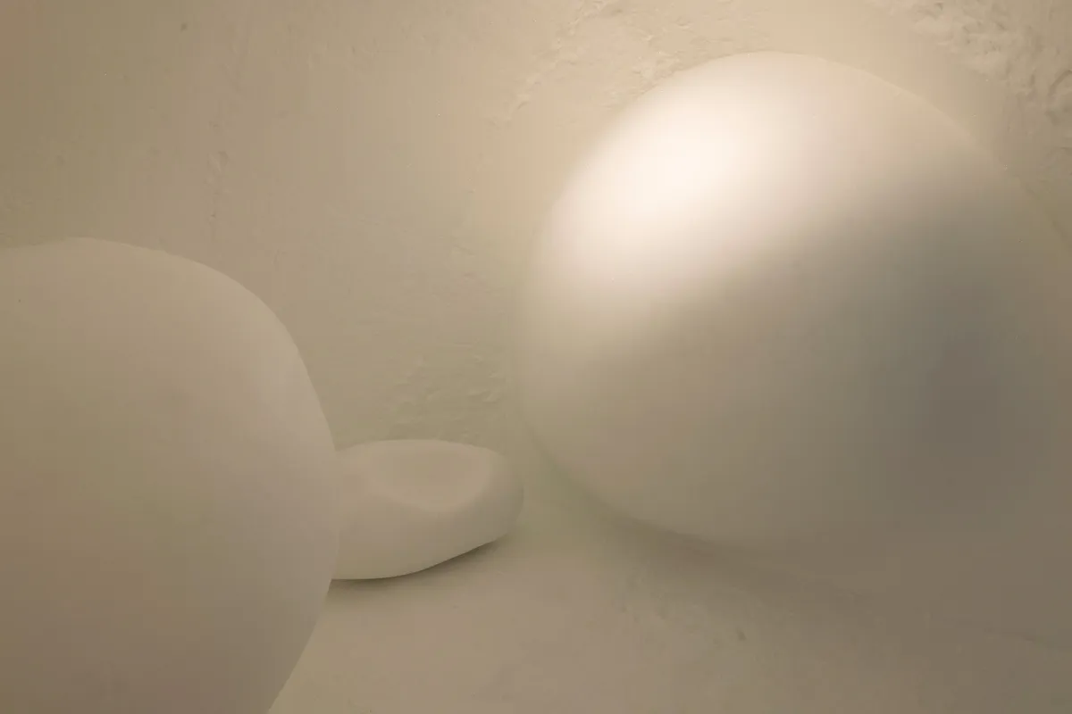 Här möts tid och rum. Det första du ser är ett vitt tomrum, och sedan uppenbarar sig en stor stenliknande form. Former vilar axel mot axel intill varandra, eller balanserar på varandra för att skapa jämnvikt.