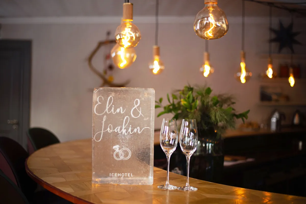 Överraska ditt ressällskap, din bästa kund eller vännen som åkt till oss för att fira födelsedagen, med ett eget budskap. Vi hjälper dig att gravera ditt budskap i is och levererar isogrammet till middagsbordet i Icehotel Restaurant.