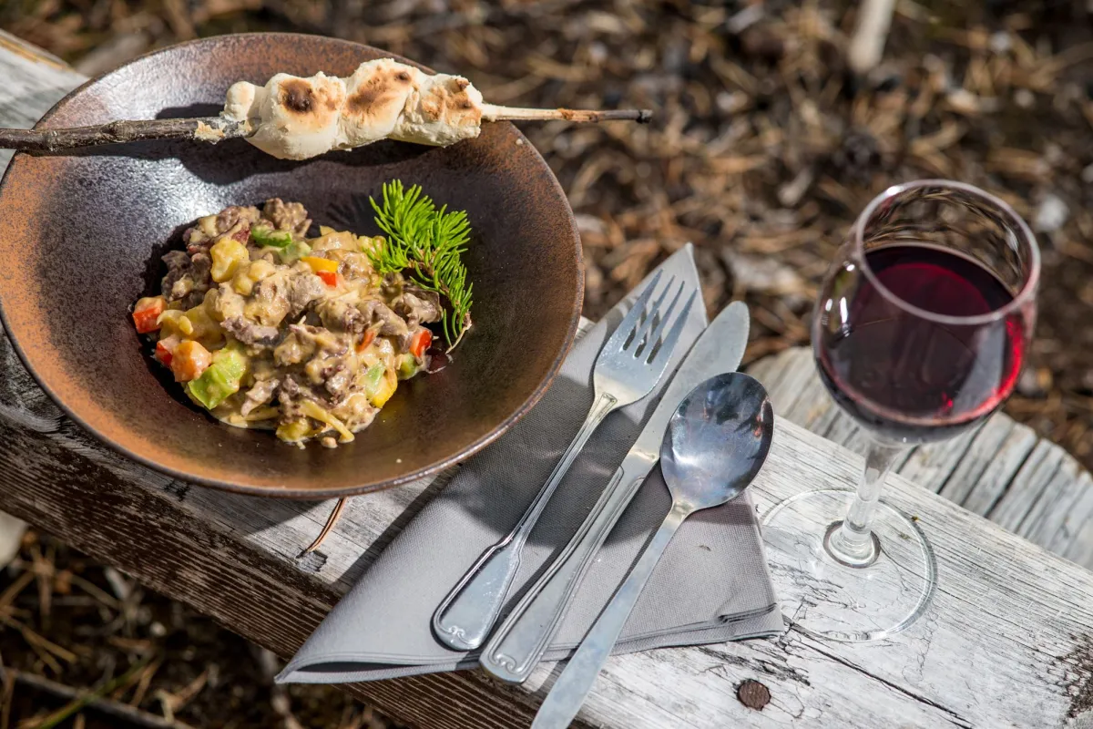 Tillsammans med en guide beger ni er ut till ett av våra vildmarkscamper. Här får ni chansen att spana efter norrsken, och serveras en trerätters middag inspirerad av naturen och lokala ingredienser.