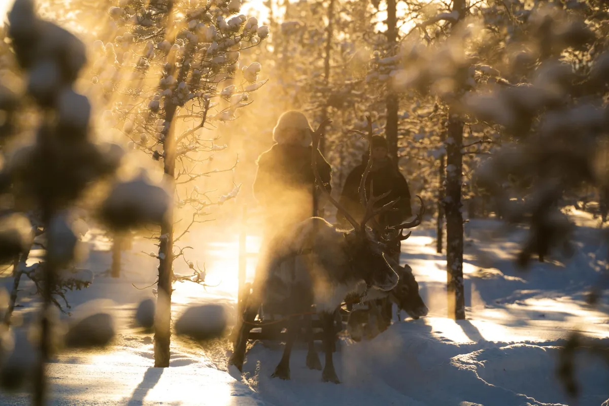 The reindeer sledding guide from Nutti Sámi Siida takes you via a short minibus transfer from Icehotel to the Sautosjohka reindeer enclosures where you will meet todays travel company, the reindeer. The guide will offer detailed instruction on handling and driving the sleds before you are ready to embark on a trip of your lifetime. Each guest drive, standing on the edge of your own sleigh. Together we drive in column with the guide and its leader reindeer at the top, through the snow-covered forest landscape and over frozen marshes and rivers.